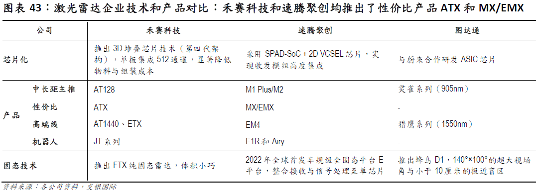 全体来看,三家公司均正在芯片化和平台化上标的目的上取得了冲破,但速腾聚创和禾赛科技正在产物结构上明显更为完美,次要表现正在性价比产物(MX/EMX 和ATX)和机械人激光雷达的结构。