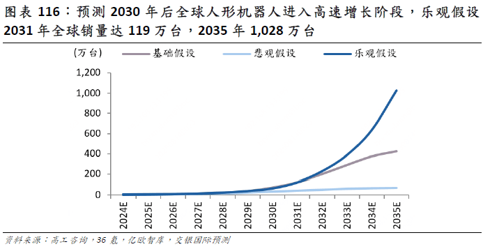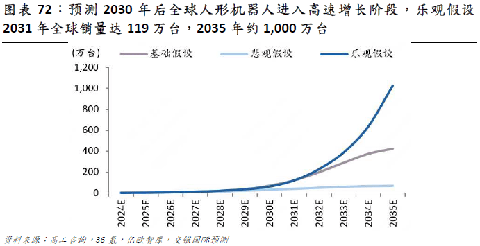 据高工财产研究院测算,2024 年全球人形机械人市场规模约为 10 亿美元,对应年出货量 1。19 万台。我们预测至 2030 年,市场规模扩容至 151 亿美元,对应年度销量 68 万台。2031 年之后,跟着中国人形机械人财产链加速降本,和大模子的泛化能力飞跃提拔,我们估计行业进入迸发式增加。这一增加曲线背后,既有工业场景从试点到规模复制的纵向深化,也涵盖新兴使用场景持续出现带来的增量空间。根本假设下,我们估计到 2035 年,全球人形机械人出货量达 400 万台,对应 2024-35 年 CAGR 70。6%。