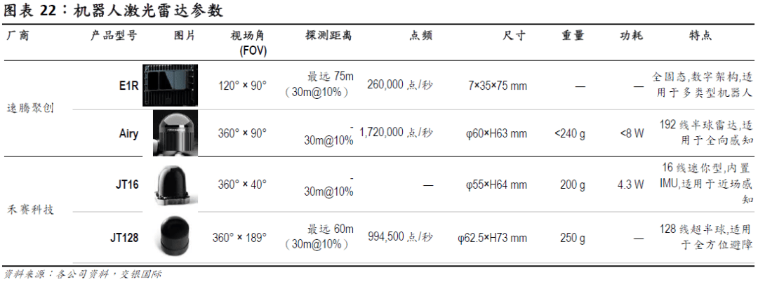 头部企业推出机械人激光雷达,相关营业高速增加。如禾赛科技、速腾聚创正在车规市场具有丰硕的配套经验和手艺储蓄,手艺研发方面具有较强劣势,推出了多款合用于机械人的激光雷达产物,产物手艺目标和靠得住性均处于行业领先程度,占领了较大市场份额。按照 OFweek 维科网财产研究核心数据,2024 年禾赛科技、速腾聚创正在机械人范畴的市场份额为 24%/15。8%。