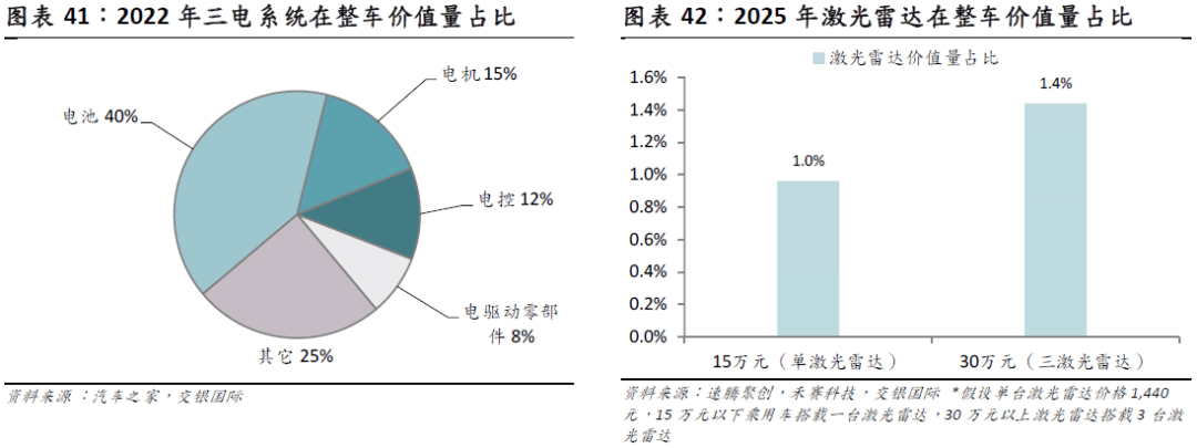从零部件正在整车价值量占比来看,当前激光雷达占整车价值量比沉相对较小,自研和自产对于毛利率提拔影响无限。2022 年,电池、电机、电控占整车价值量为 40%/15%/12%;按照禾赛和速腾聚创最新产物价钱,按照单台 200 美元(约合 1440 元人平易近币)计较,假设 15 万元乘用车搭载一台激光雷达,30 万元乘用车搭载 3 台激光雷达,激光雷达的价值量占比不脚2%。