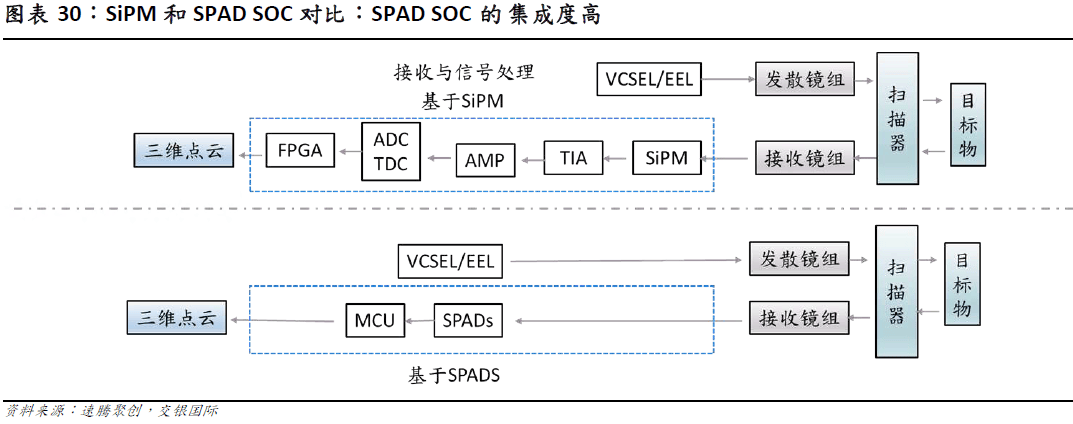 SPAD-SoC(单光子雪崩二极管系统级芯片)正成为领受端降本的环节器件。保守的 SiPM 方案素质是模仿方案,虽然其内部仍由多个 SPAD 单体构成,但输出的是模仿电流信号,需配套 TIA(跨阻放大器)+多比力器+ADC+FPGA 等复杂模仿链来还原信号。因为受限于模仿布局,很难将前端领受取后端处置整合,导致系统分离、连线复杂。这种架构存正在几个较着的短处:成本高、系统大、抗干扰差。