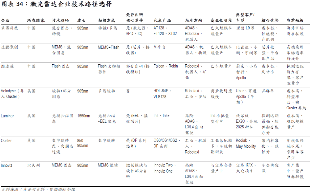 从手艺层面来看,海外企业多选择高机能、高精度、高复杂度的手艺方案,强调手艺领先但落地节拍慢、成本高。中国企业则是更倾向于走芯片化、全固态、小型化、低成本、可量产径,强调市场落地,避免了晚期海外企业过度逃求高机能、高价钱线所带来的落地难题。手艺上的差别最终导致了贸易化径的分化:中国企业率先实现低成本、车规化、规模量产,普遍进入如比亚迪、抱负、小鹏等新能源车支流车型;而海外企业则仍多聚焦于L4、Robotaxi、工业检测等高精度场景,进入乘用车前拆市场较为无限。