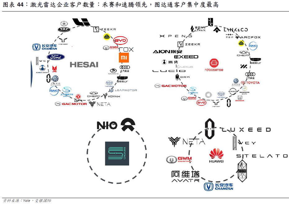 华为次要合做模式是通过鸿蒙智选和 HI 模式,次要客户是问界、智界、阿维塔、极狐等品牌。图达通焦点客户是蔚来汽车(收入占比超 90%)。因而从客户多元化角度来看,激光雷达企业的排序为:禾赛/速腾华为图达通。