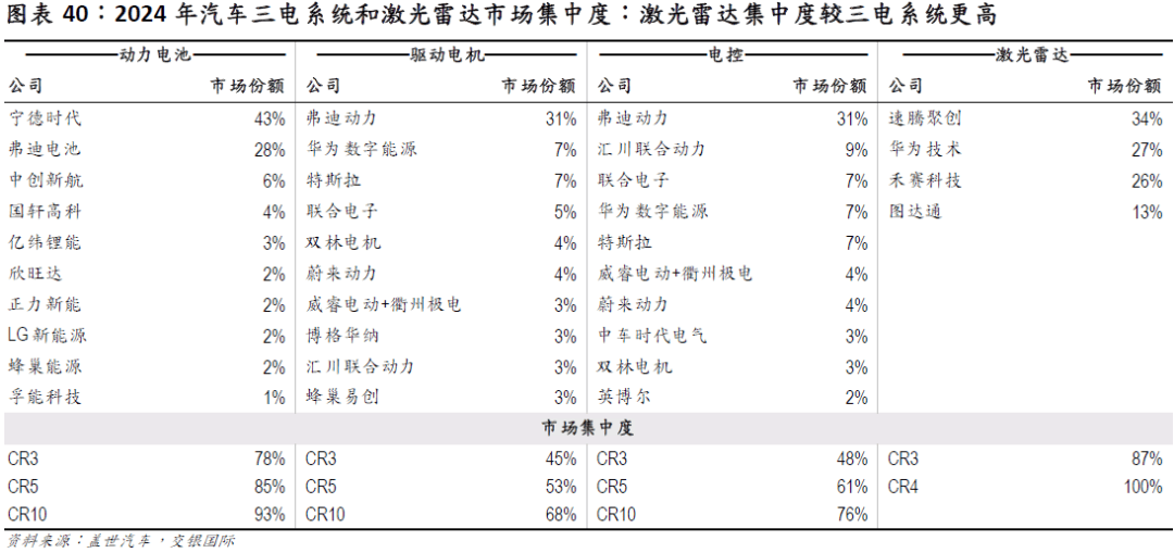 出于对环节零部件的自从可控,大都车企选择自研焦点零部件,特别是正在价值量占比力高的三电系统。电机范畴,特斯拉、蔚来驱动、长安汽车产物均实现完全自供;电控范畴,特斯拉、蔚来驱动和极电电动均为自供;电池范畴,车企自研的案例包罗比亚迪的弗迪电池、长城蜂巢能源、广汽埃安旗下因湃电池。 2024 年电池的 CR3/5/10 市占率别离为 78%/85%/93% ,电机为45%/53%/68%,电控为 48%/61%/76%。激光雷达市场集中度高于三电系统,四家企业几乎占领了全数中国内地市场。