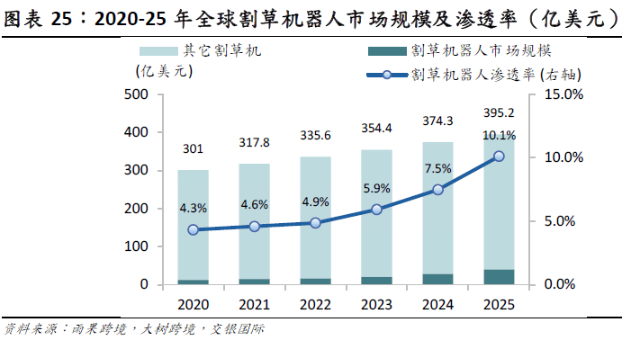 目前激光雷达正在机械人范畴的新增使用次要集中正在消费级机械人(例如割草机)和 L4 级从动驾驶卡车等范畴。消费级机械人激光雷达出货量正在 2025 年加快,2025年4月禾赛科技取逃觅生态链可庭科技告竣计谋合做,将来一年内,禾赛科技将为可庭科技供给 30万台J系列激光雷达,赋能逃觅割草机械人速腾聚创则凭仗E1R获得库犸120万台订单,用于割草机。按照雨果跨境数据2020-24 年全球割草机械人渗入率从 4。3%提拔至 7。5%,跟着界割草机等智能化产物的普及,将来割草机渗入率仍有很大提拔空间。