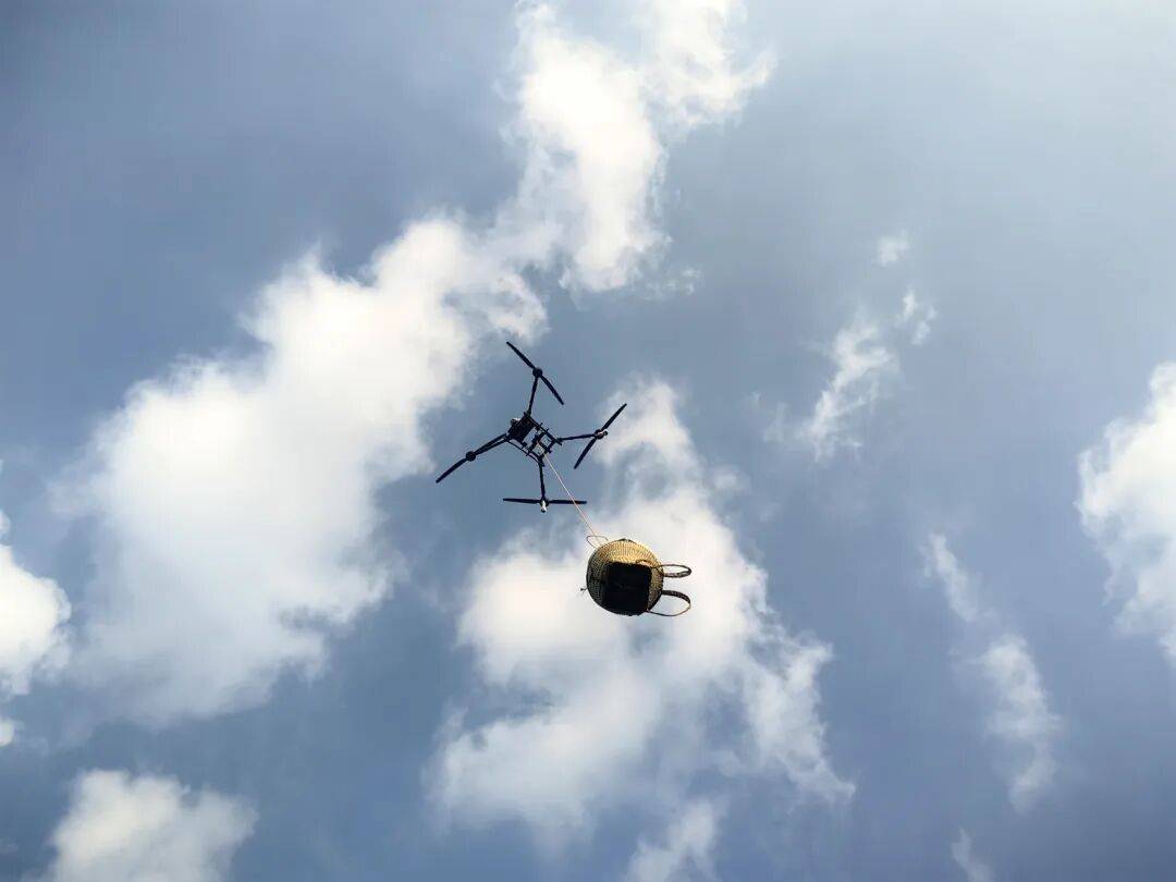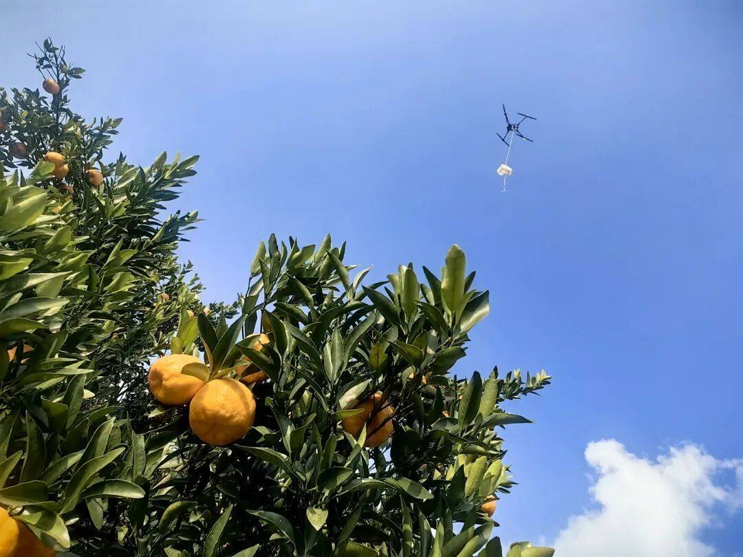 一阵阵旋翼声由远及近,一架农用无人机下降正在筐旁,工做人员将筐架挂上挂钩。跟着无人机升空,满载着柑橘的果筐腾空而起,径曲飞过层叠的果园,向不远处公边的集点缀飞去。紧接着,第二架、第三架无人机连续飞来,反复着“下降-挂钩-起飞”的流利动做。